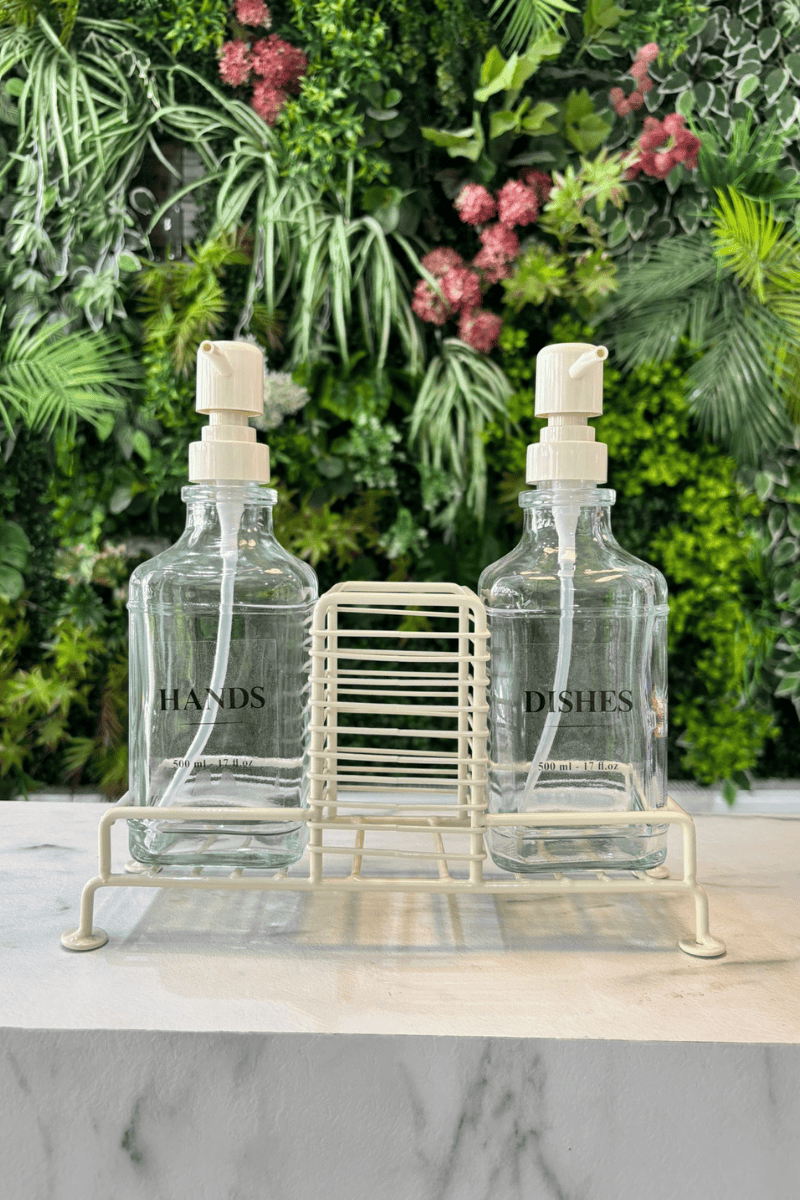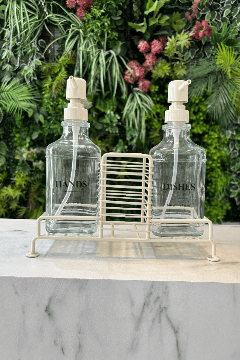 2 li Metal Standlı Cam Sıvı Sabunluk Seti Krem Renkli